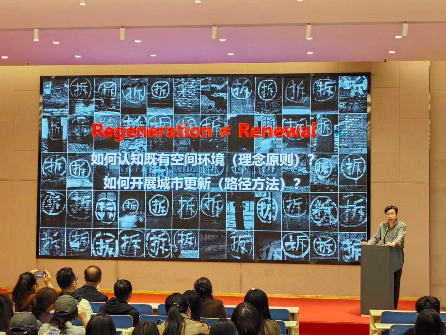 据悉李教授在建筑设计、城市规划等方面有着极深的研究。他希望与坐师生能够把握机会,开拓视野。随后李昊教授通过经典案例阐述了其主题观点。他讲到造成当今城市发展的重大问题的主要原因:“只注重建筑‘形’的风格标签,忽略历史的多元价值”、“只关注建筑‘体’的单一存在,忽略共时的环境场所属性”和“只关注建筑‘物’的文化属性,忽略基本的人居职能”。其中他提出当代中国古城改造存在的“在地生活被割裂、历史符号被静置、主题景区被消费”的弊病。其中还讲到“存此不存彼”“见屋不见境”“见物不见人”的观点。随后阐释了“如何认知即有空间环境(理念原则)、如何开展城市更新(路径方法)”进而展示了反思-转型-回归-实践的总思路。他通过丰富的案例和生动的语言,将整场讲座的气氛推向了高潮。讲座的最后,李教授对同学们提出了几点期望和要求。他希望大家能够培养创造性思维,打破思维定式,学会培养独立的价值知识体系,为未来的城市发展和建筑设计做出更大的贡献。