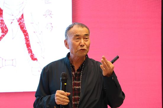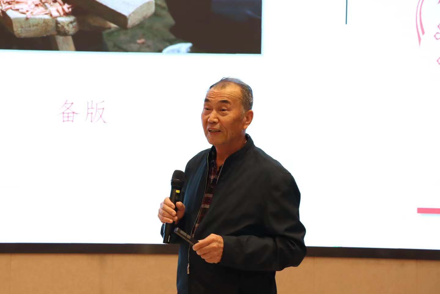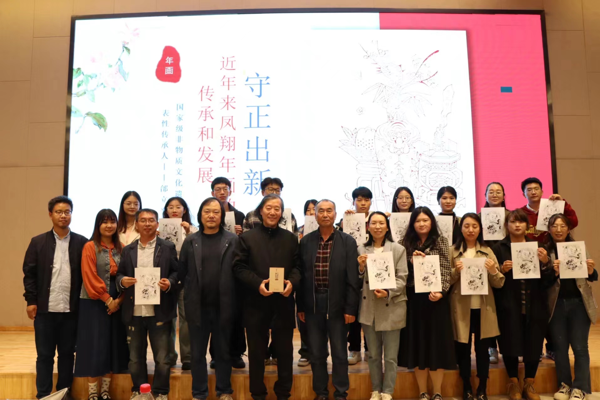 邵立平先生结合多年的实践经验,从凤翔木板年画的历史渊源、题材内容、制作工具和技艺流程四个方面为大家做了精彩的讲解,就如何成功创作具有地域和民族特色的木板年画畅谈了自己的感悟和体会,并对“非遗”文创产品做了相关介绍,提出了自己独到的见解。他表示,民间艺术是民族文化之根,越是民族的,越是世界的,传承之业要想延续生命,首先要守住初心,打造精品,在此基础上积极融合创新元素,将民间非遗文化与高校教育有机结合,让更多年轻人进一步了解中国传统年画。