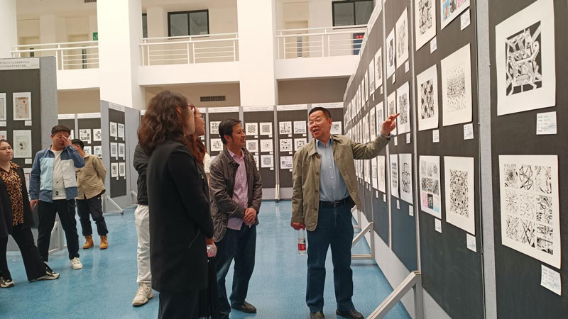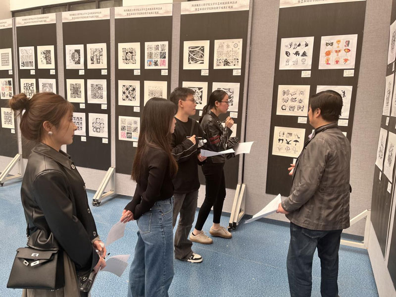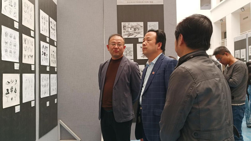 副董事长李宗领与教务处副处长时晓楠参观《图形创意》展区