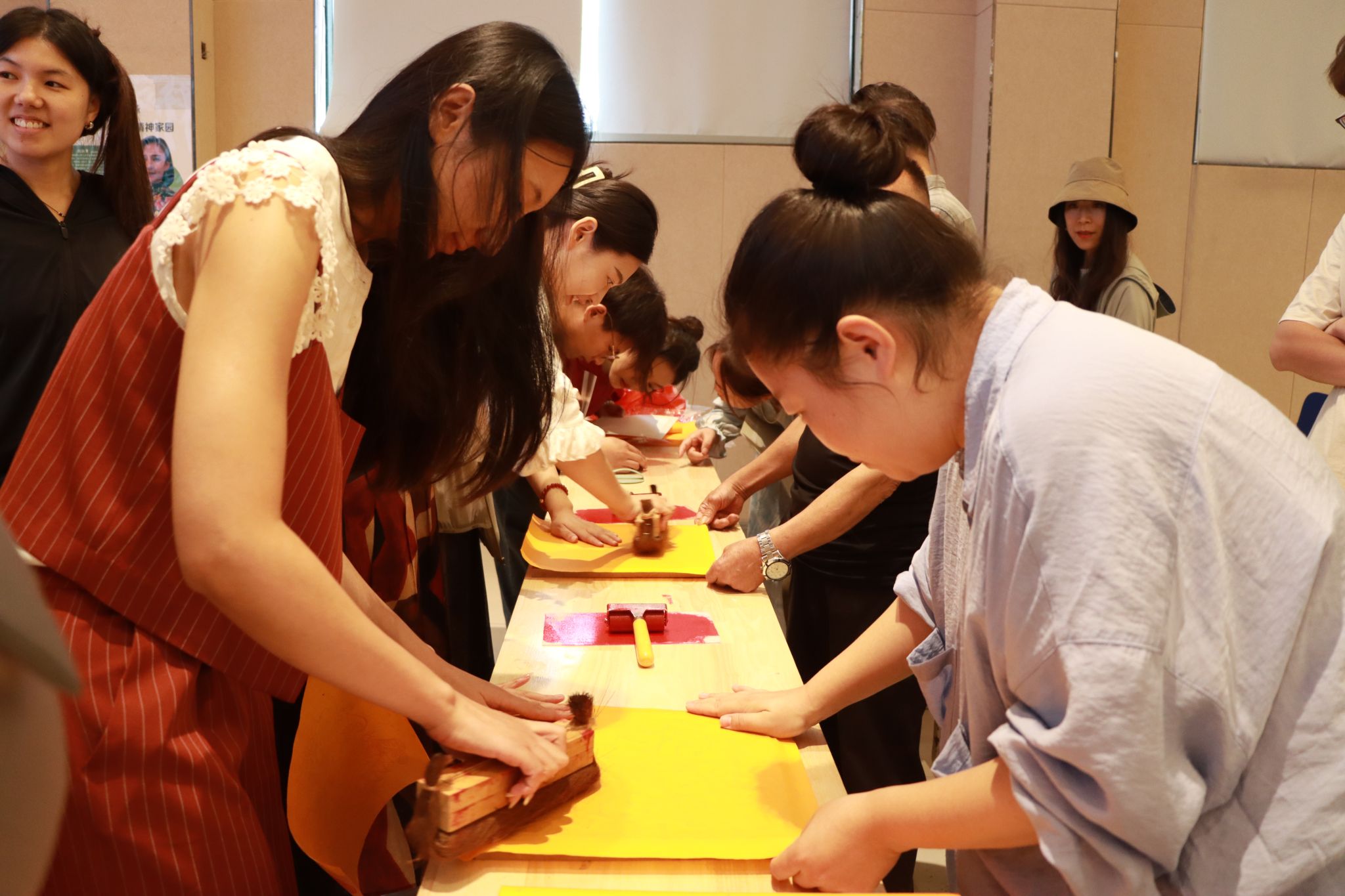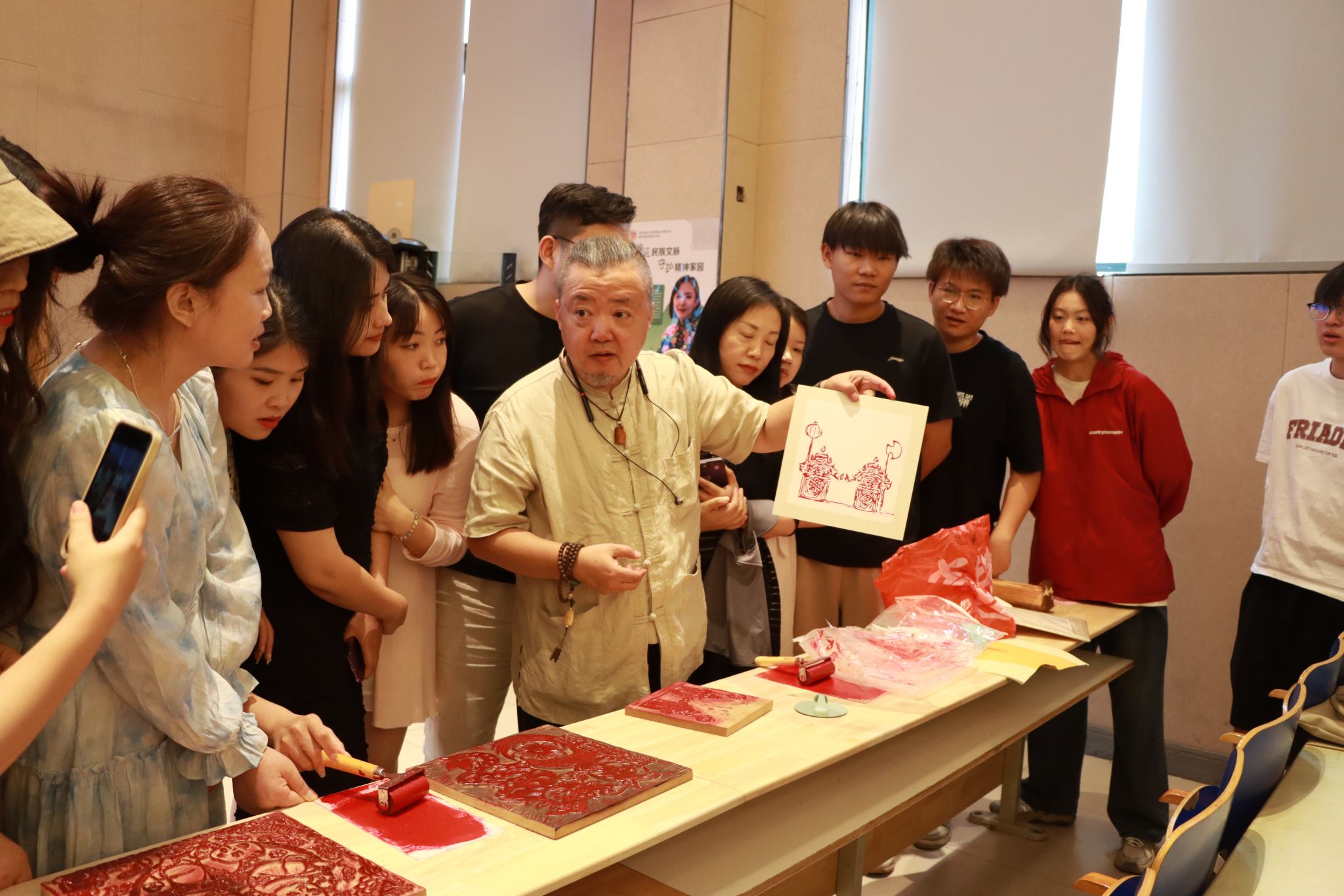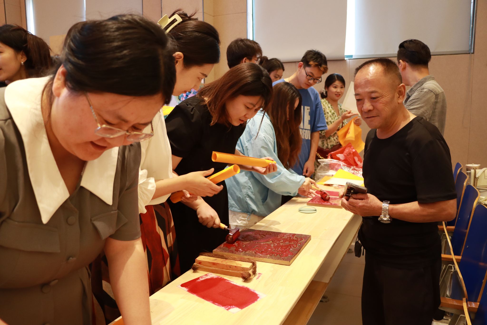 讲座后,西安非遗保护协会对外联络中心主任马萌带领现场的师生们共同体验了木版年画的着色、落纸、压纸、起纸的印制过程,带领同学一起体验和感受了中国传统文化的独特魅力。