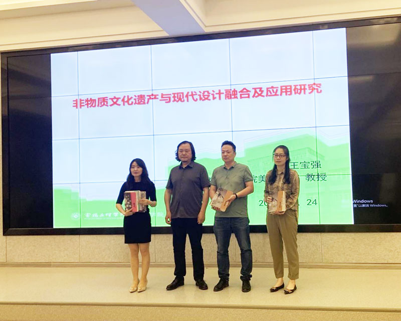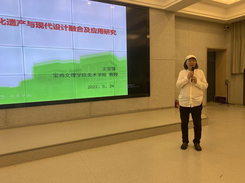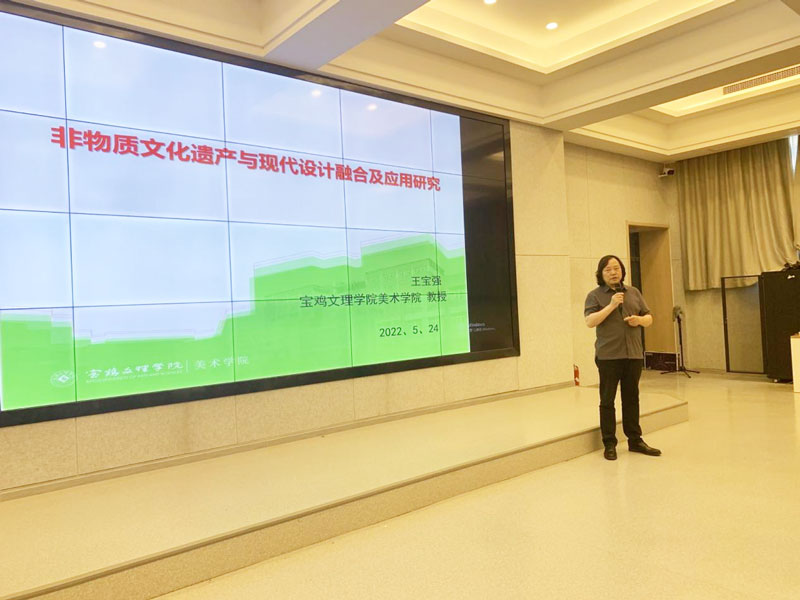 王宝强教授主要从“非遗”的内涵价值和意义,“非遗”民间美术与现代设计融合的实践探索,教研与创作实践成果等方面做了精彩阐述。他表示地方高校在开发地域文化艺术资源方面,有着得天独厚的条件,应充分发挥地方文化资源优势,开发利用地方民间美术资源,丰富现代艺术教育的内容,将传统“非遗”文化融入现代设计,促进民族文化的创新发展。
