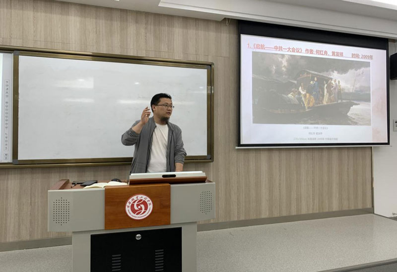 薛富成副教授以“以画为体 以史为魂”为主题进行讲述。分别从美术经典《启航—中共一大会议》、《革命理想高于天》、《转战陕北》、《南昌起义》、《开荒牛》等作品入手进行党史讲授,感受党的光辉与力量。