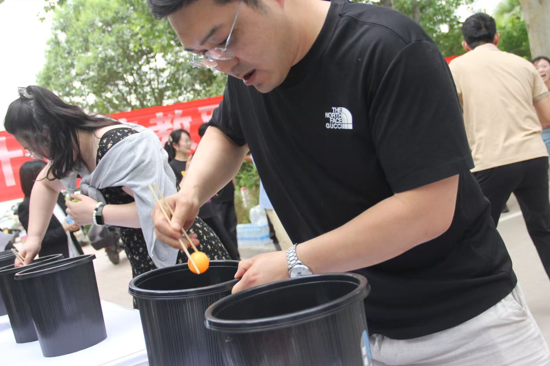 活动伊始,工会委员庞理科以轻松诙谐的口吻详细讲解比赛规则,并宣布比赛开始。本次运动会精心设计了8字绕绳、百发百中——定点投壶、10米折返夹乒乓球接力、穿针引线和呼啦圈大挑战五项比赛。教师们化身“优雅谋士”,或手拉手穿梭于长绳间,或附身瞄准,或豪迈投掷,默契配合引发阵阵欢呼。“穿针引线”的指尖专注和“呼啦圈大挑战”的律动摇摆更是将现场氛围推向了高潮。经过激烈比拼,最终比赛决出一、二、三等奖各一组。