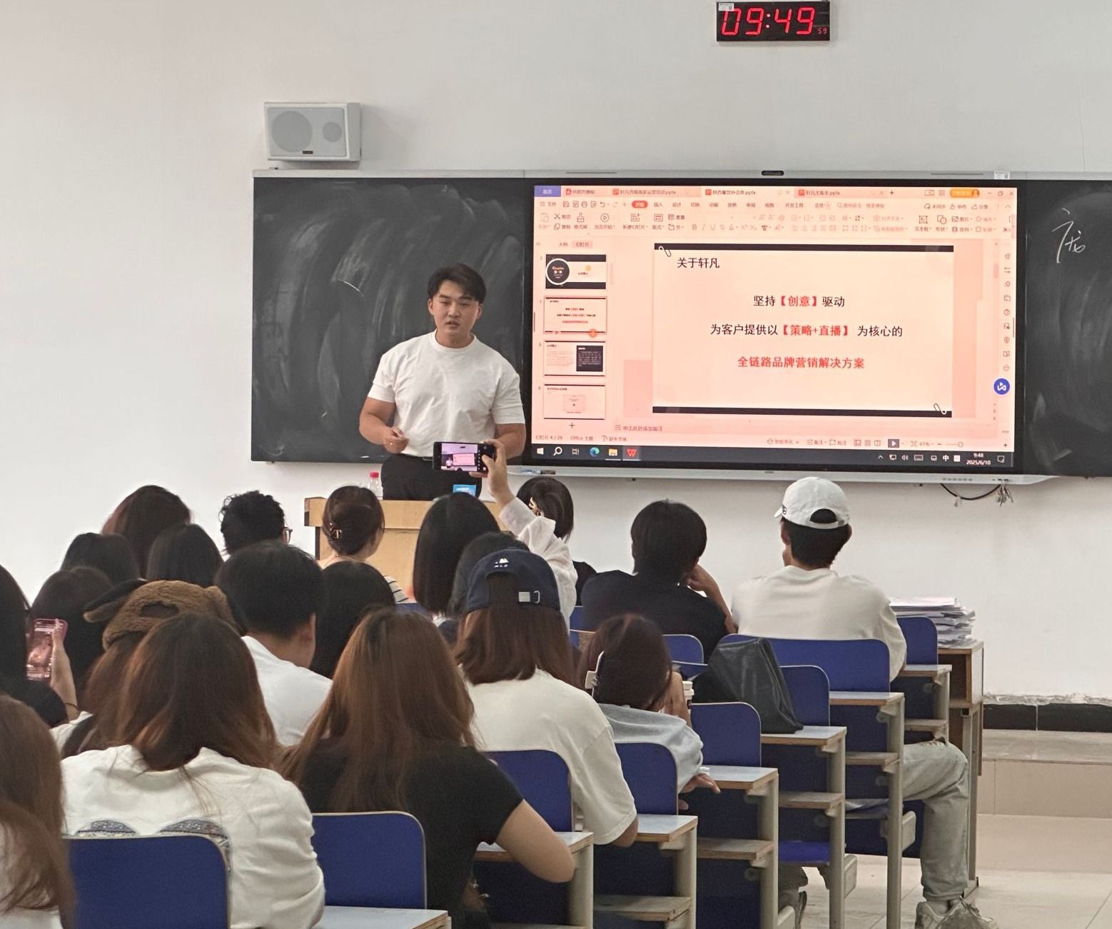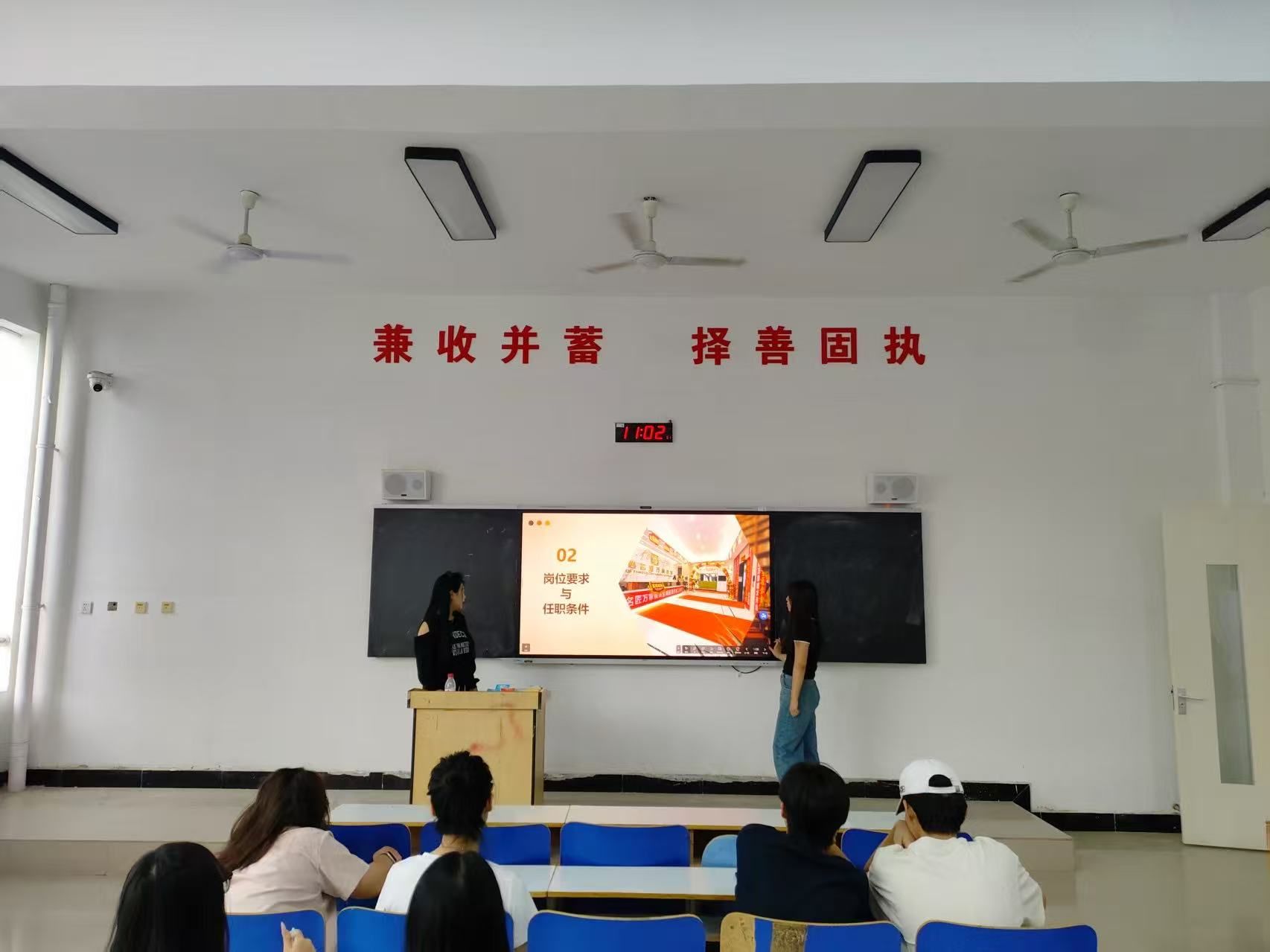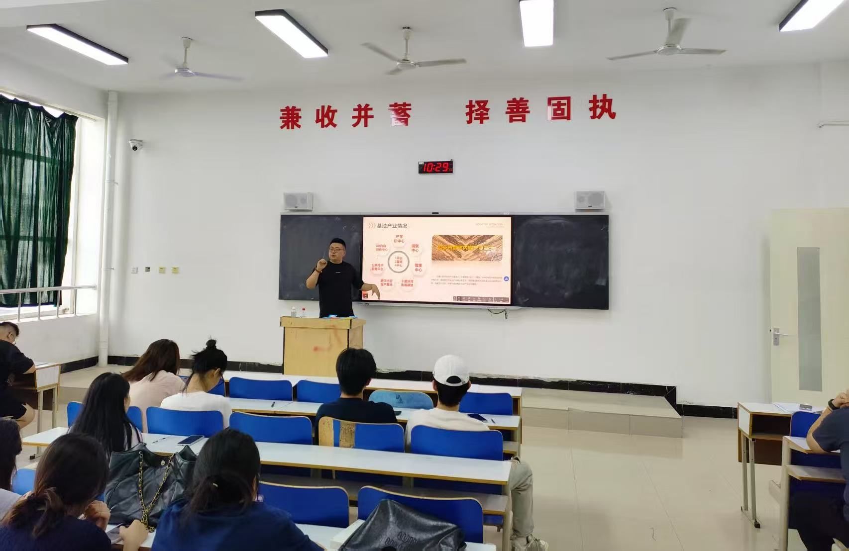 宣讲环节,来自陕西飞轩凡文化传媒有限公司、西安点晴信息科技有限公司、西安爱克斯未来文化科技有限公司以及陕西名匠万家装饰工程有限公司的相关负责人为同学们介绍了公司在新媒体运营、内容创作、短剧后期制作、建筑装饰设计等方面的项目实践,重点阐述了为实习生量身定制的培养计划、岗位职责、专业能力要求以及极具吸引力的实践内容与发展前景,点燃了员工们积极投身实践、探索职业可能的热情。