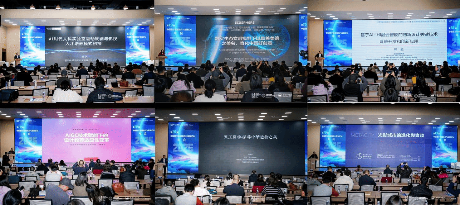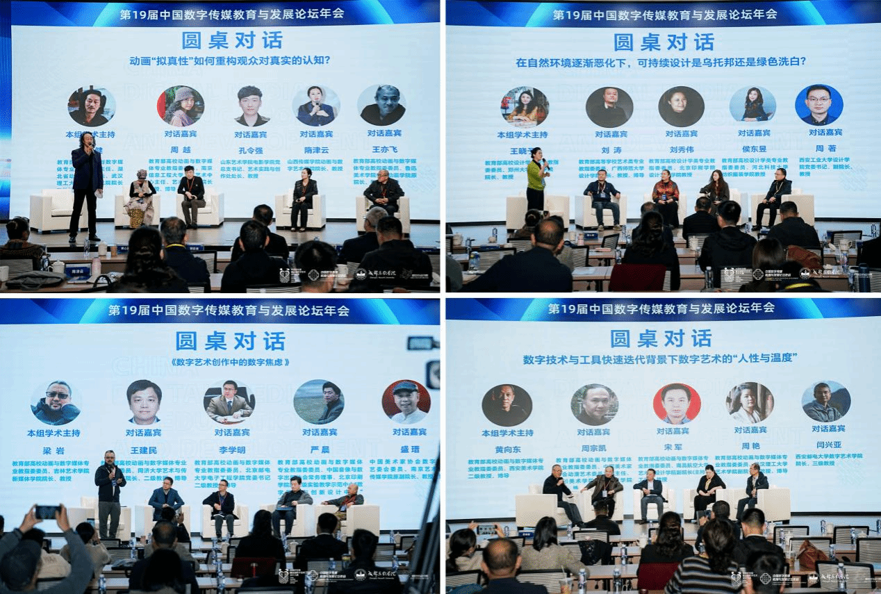 学术交流环节聚焦行业前沿,上午由教育部高校戏剧影视专业教指委委员、浙江传媒公司副董事长姚争教授、教育部长江学者覃京燕、韩挺及全国高校美育教指委委员金江波,分别围绕文科实验室建设、创意培育、技术融合、文化传承等主题作专题报告。同期,朱明健、吴小华两位专家分别主持“动画‘拟真性’与真实认知重构”“自然环境恶化下可持续设计定位”圆桌对话,为行业发展痛点建言献策。下午学术研讨持续深化,国务院学位委员会设计学学科评议组成员孙守迁、教育部相关教指委委员康修机、余隋怀、蔡新元等专家,依次围绕设计升级、专业改革、文化挖掘、AI应用等核心方向分享研究成果;梁岩、黄向东两位专家主持“数字艺术创作中的数字焦虑”“数字技术迭代下艺术的‘人性与温度’”专题对话,深化数字艺术人文价值探讨。