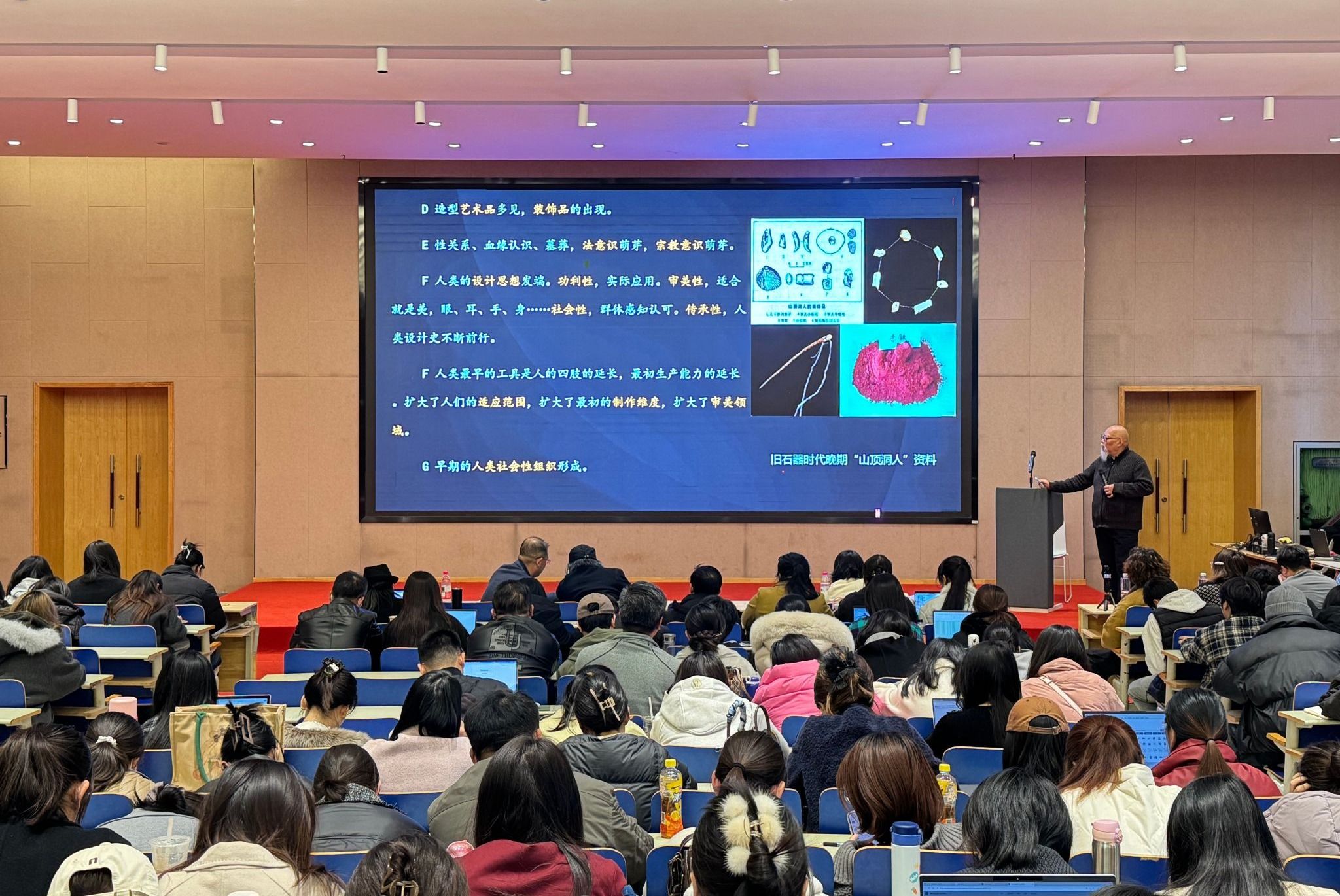 整场讲座内容翔实,逻辑清晰,主要围绕“设计的本质、起源与端点”、“历史认知与考古学的关系”、“设计考古学的理论与方法构建”以及“基于考古学视角的古代设计史分期”四大核心板块层层展开。在结语部分,周教授再次强调了设计考古学在连接历史与未来、深化设计学科内涵方面所能发挥的重要作用。