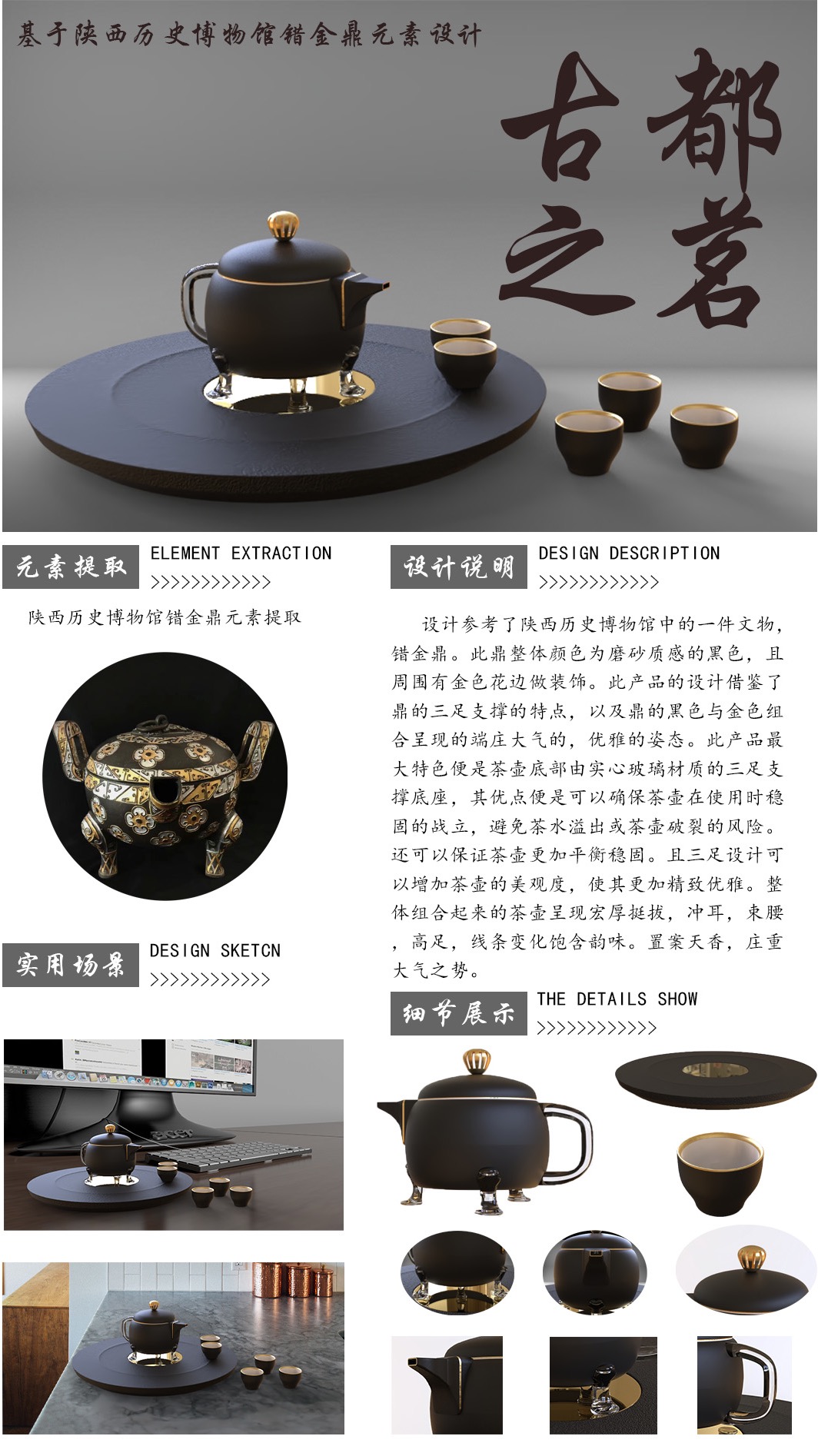 2023年陕西省老员工工业设计大赛以“进化·协同·共生”为大赛主题,根据目前工业设计及相关专业教育发展新要求,设置智慧出行方式、数字智能创新、文化创意产品、乡村振兴设计、绿色可持续设计五个参赛类别。针对本次比赛,公司师生成立多个设计项目小组,围绕西安深厚的历史文化进行设计展开,整理并重构大西安区域内具有代表性的历史符号,分析市场中文创产品的特性与用户需求,结合三维打印与虚拟展示技术进行设计的打样与表现,以呈现出最具人文表象的文创设计作品。