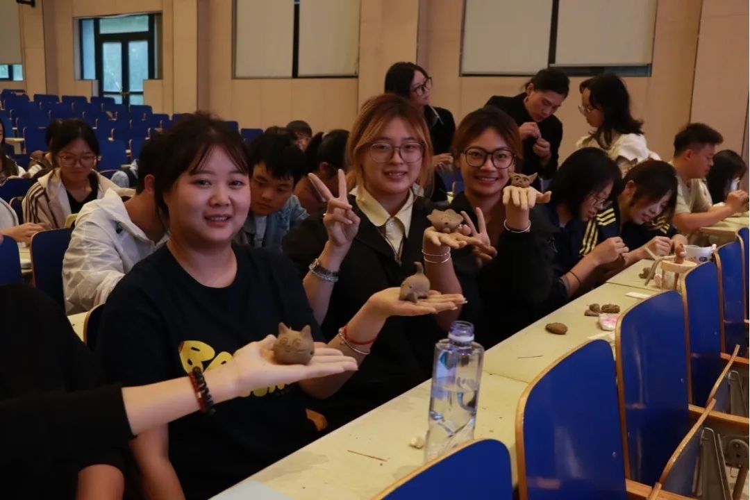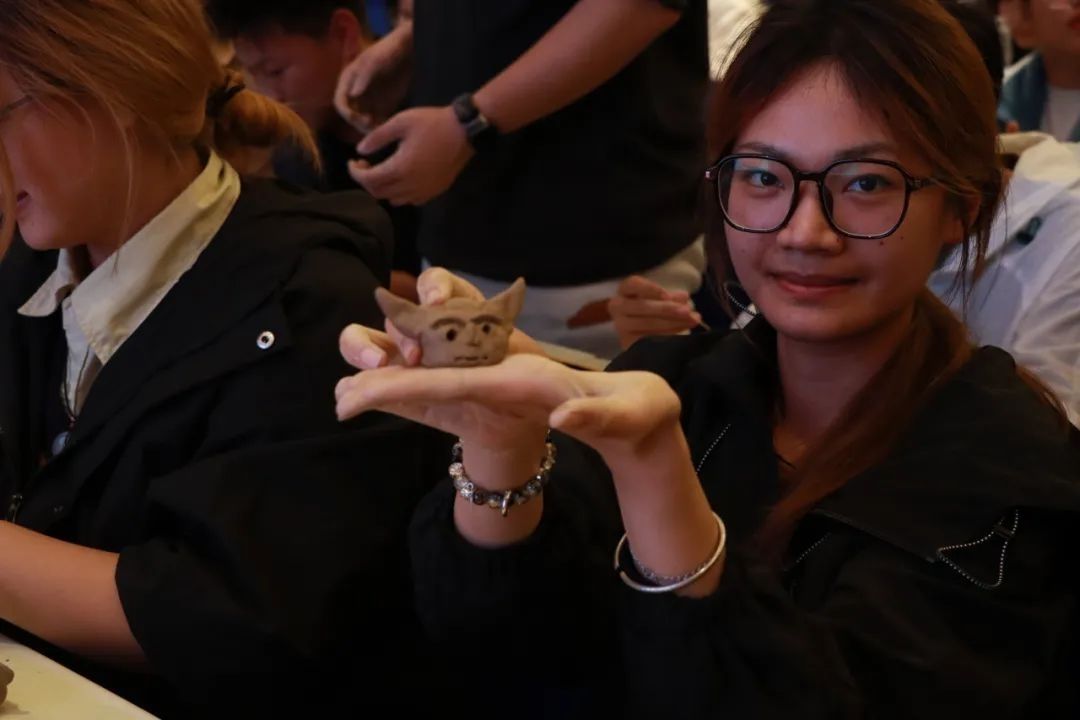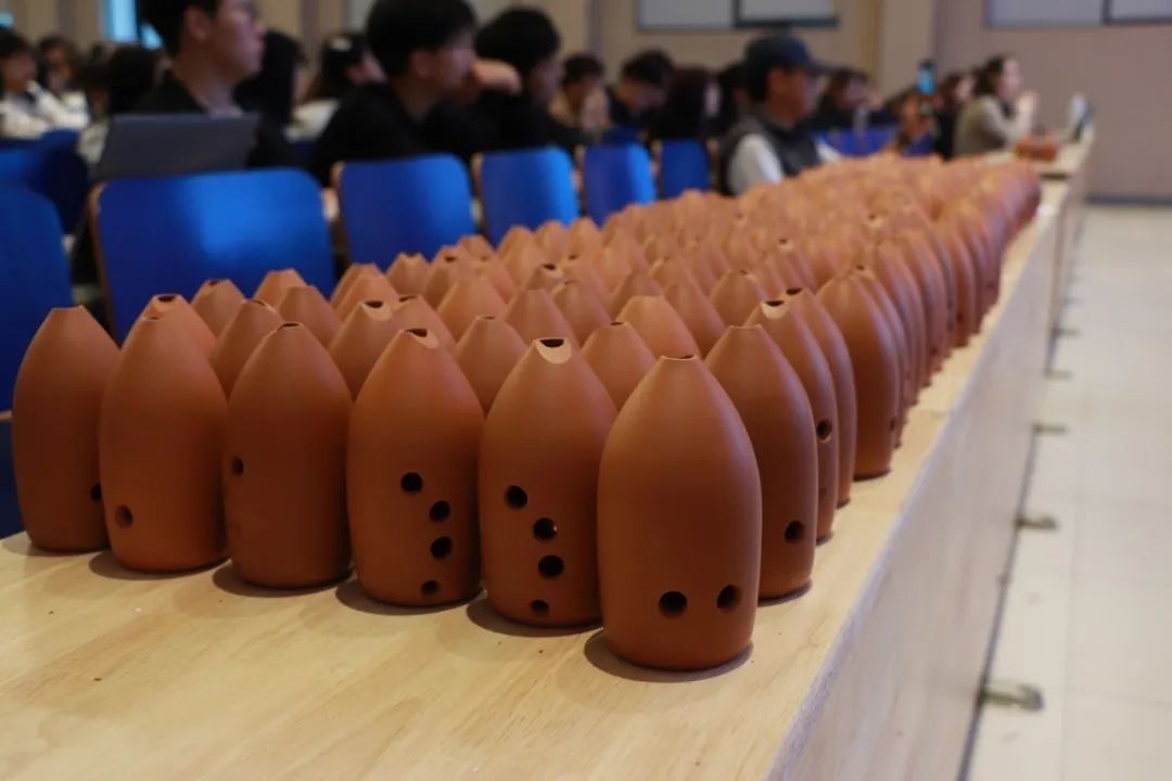 讲座还设置了学习互动环节。梁苗老师为同学们讲解并示范了陶埙演奏的基本技巧和练习方法,并结合曲谱让同学们亲自体验陶笛的吹奏。演奏环节结束后,梁苗老师为每位同学发放了制作陶埙、陶哨的陶泥,从塑形、钻孔、修整等方面现场教大家制作属于自己的陶埙。互动环节生动有趣,欢笑声与笛声交汇,现场气氛融洽。