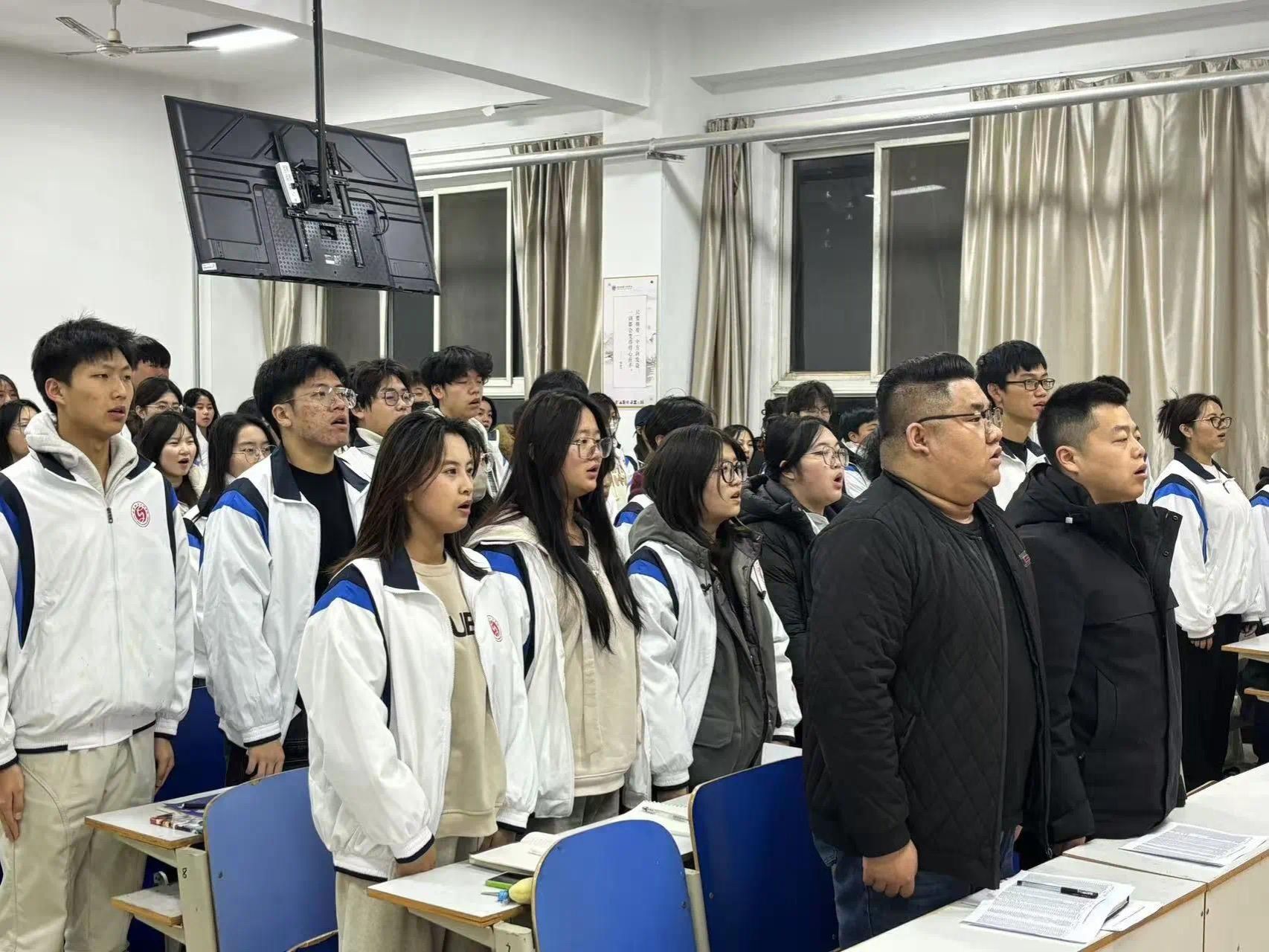 仪式在庄严的国歌声中拉开帷幕,全体师生肃立,目光坚定地注视着国旗。