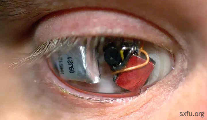 不过你要知道,这可不是简单的眼睛假体。它内置了一个潜入挤压成超薄状态的数码相机的 6mm 的智能手机。因此它可以通过微型发射器向远程屏幕发射模拟信号。然后厉