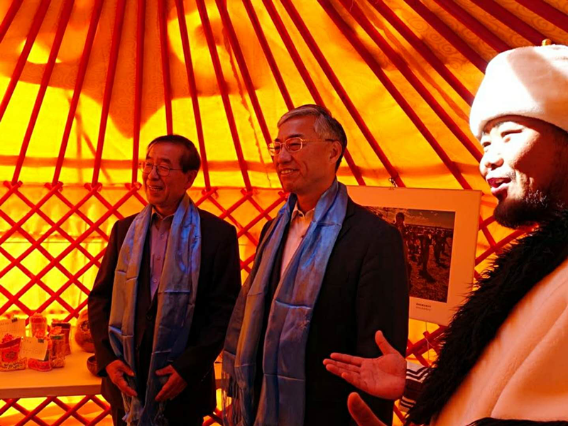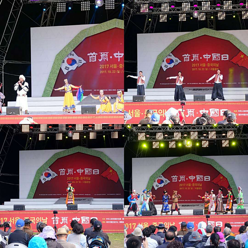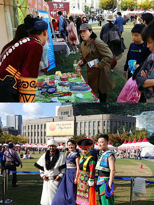 北京民族文化遗产保护基金会与北京中华民族博物院共同为首尔的民众带来了动听的歌声、优美而独具特色的民族舞蹈、绚丽多彩的民族服饰的展示。由蒙古族艺术家带来的蒙古族非物质文化遗产马头琴演奏将观众带到了辽阔的大草原,一曲《牧歌》嘹亮而悠远,蒙古族姑娘的《筷子舞》和《顶碗舞》让观众拍手叫绝。白族艺术家一曲原创歌曲《飞》将演出带向了高潮,观众随着节奏摇摆双手。傣族舞蹈《竹林深处》将观众带到了风景秀美的云南德宏,悠悠细雨,维美至极!中国56个民族的服饰就像56朵花,分布在中国的各个部分,点缀着神州大地。中国56个民族服饰各具特色,他们色彩缤纷、绚丽多彩。蒙古族、土族、白族、傣族、裕固族、白族、土家族、藏族、彝族等12个民族的兄弟姐妹们身着盛装为首尔的观众演唱了《各民族祝酒歌》将此次活动带向了尾声。此外,北京民族文化遗产保护基金会与北京中华民族博物院还将大草原上的蒙古包搬到了首尔广场,让首尔市民能够了解到蒙古族的衣食住行等各方面,邱洪国大使和朴元淳市长进入蒙古包体验蒙古族的欢迎仪式。此外各种民族的美食品尝和手工艺品展示让首尔市民对中华民族绚丽多彩的民族文化有了更深一步的认识。