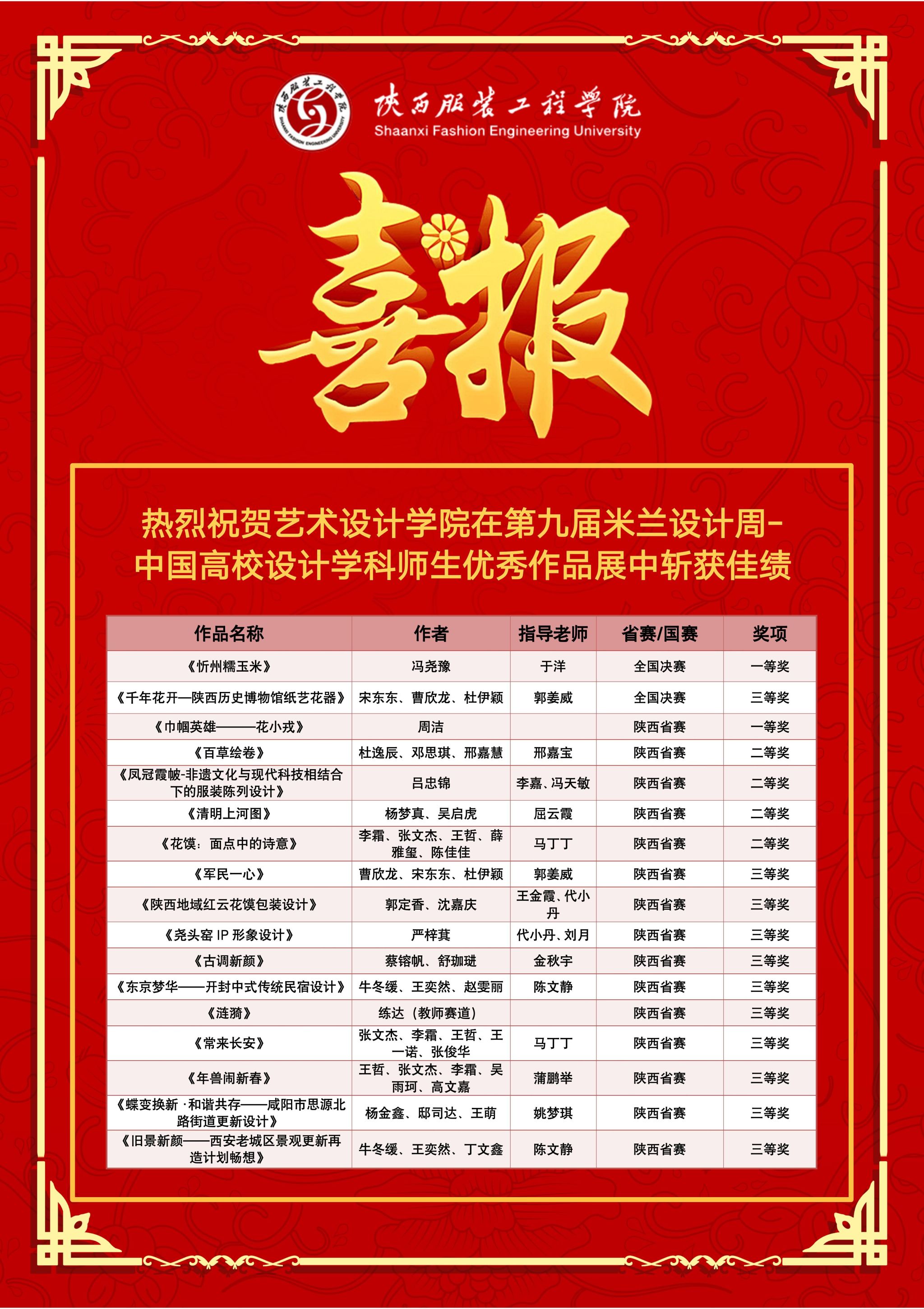 365英国上市官方网站在第九届米兰设计周-中国高校设计学科师生优秀作品展共斩获17项大奖,其中全国决赛2项、陕西省赛15项。在全国决赛中,于洋老师指导的冯尧豫作品《忻州糯玉米》,荣获设计赋能“土特产”助力乡村振兴赛道全国决赛一等奖;郭姜威老师指导的宋东东、曹欣龙、杜伊颖作品《千年花开—陕西历史博物馆纸艺花器》,获得中国博物馆文创产品设计赛道全国决赛三等奖。陕西省赛中,公司收获一等奖1项、二等奖4项、三等奖10项。...